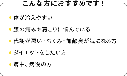 岩盤浴メニューは、冷え性や寝つきの悪さなど、さまざまなお悩みを抱える方におすすめです。